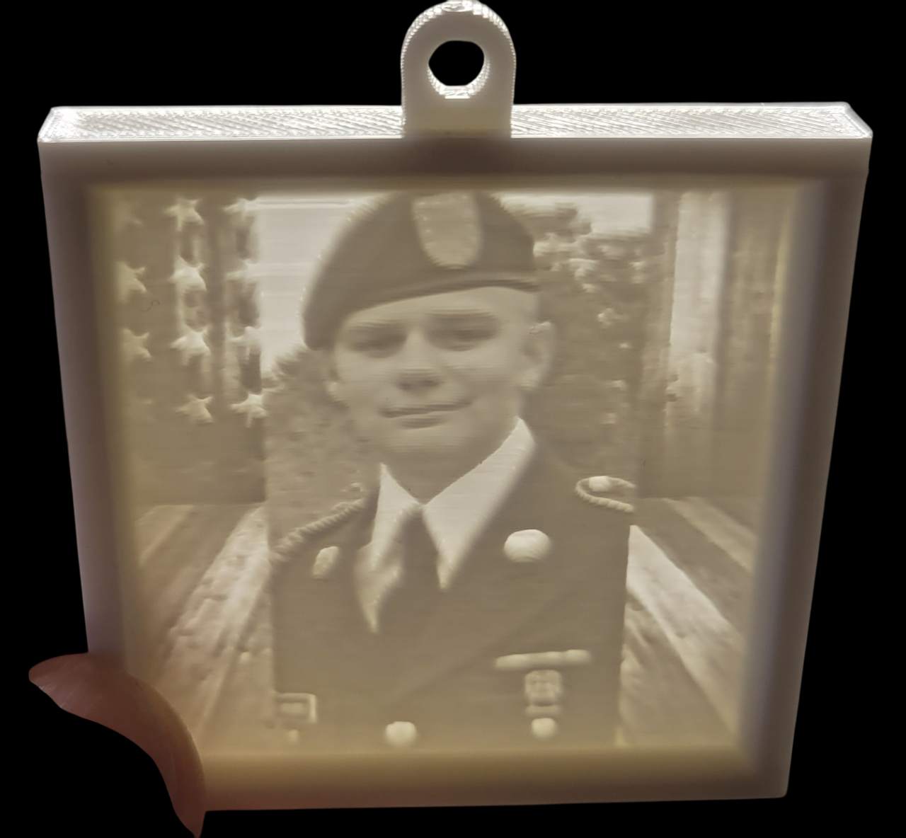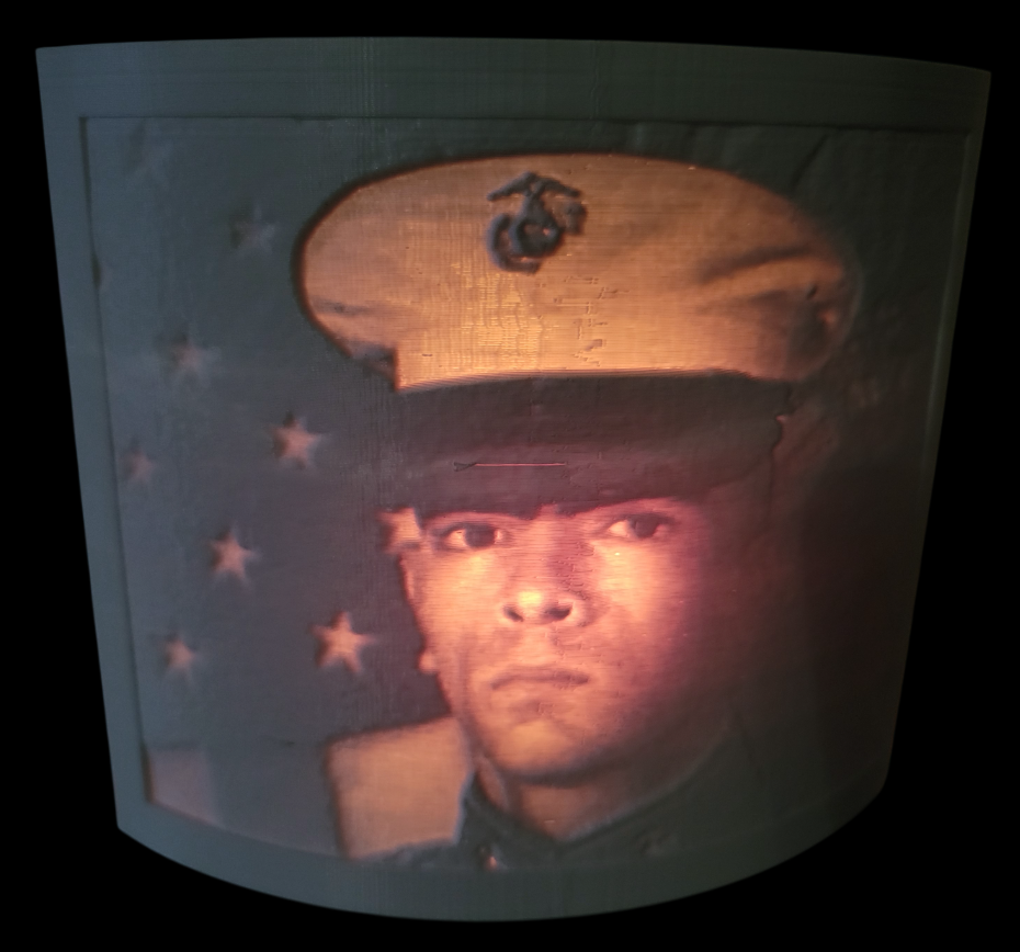 A thin plaque, made of 3D-printed plastic, with an image that becomes visible only when lit from behind.